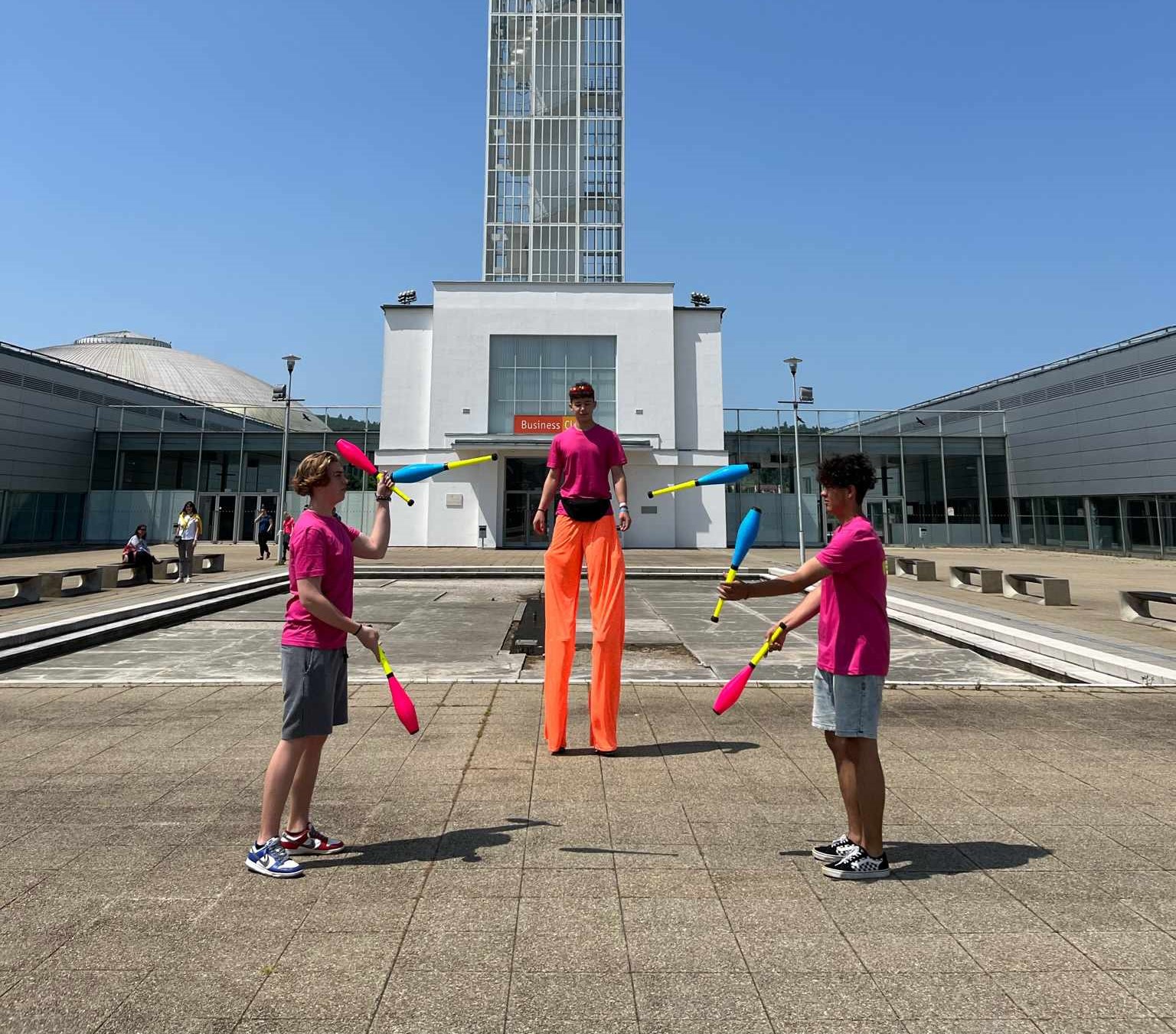 Vystoupení ve dvojici na přibližně 5-10min., které oživí nejednu stage a událost. Výhodou je, že zde není velký nárok na prostor, vystoupení je možné v interiéru i exteriéru. Doporučujeme v kombinaci s žonglovacím workshopem, tak aby si i diváci mohli vyzkoušet zkrotit nejeden míček ve vzduchu. Žonglování výborně rozvíjí koordinaci a jemnou motoriku.